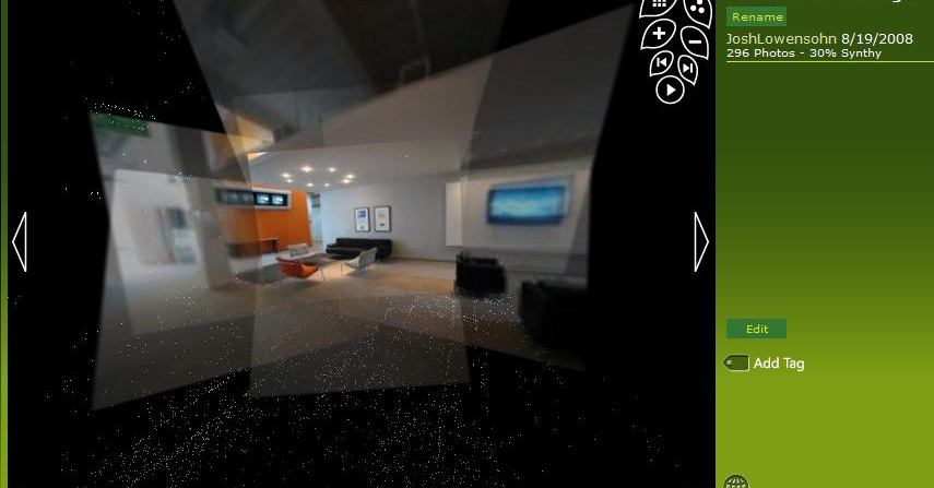 還記得微軟的Photosynth?這個程序可以通過照片的拼接實現景觀或建筑物的3D效果。周三微軟Live實驗室放出了Photosynth的3D室內環境效果演示,該演示展示了通過幾張照片實現無縫室內3D環境。