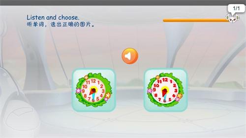 圖片上有兩個鐘,小朋友們乍一看上去,是不是覺得鐘上的時間是一樣的呢?小朋友們要仔細觀察呢,我們發現鐘上的分針都是指到6的位置,是一樣的哦,但是時間所指的位置就有所不同了,左邊的時針指在7和8之間,右邊的時針指在6和7之間,認識鐘的小朋友都知道左邊是7:30,而右邊卻是6:30。正確認識鐘以后,我們要開始聽錄音了哦,按一下黃色的小喇叭,我們聽到的是half past seven,是幾點鐘呢?小朋友們仔細回想一下,老師上課說過的7點又過了一半,那是7:30呢,于是我們很快就可以選擇左邊那幅圖片呢。
