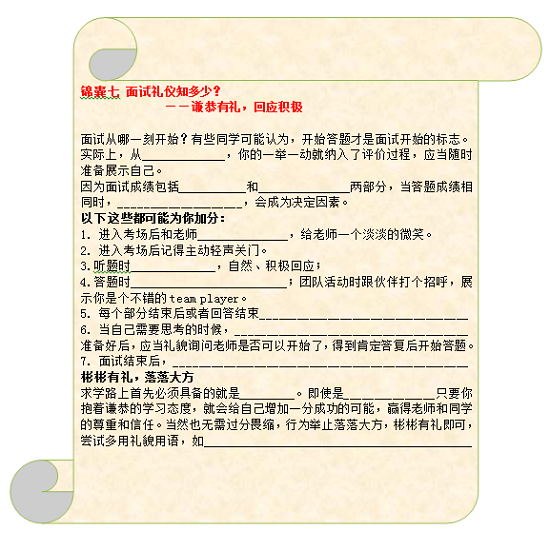 說明:面試中,言談舉止也能從側面體現學生的綜合素質,該錦囊為學生總結了應注意的禮儀細節并當堂演示操練,幫助孩子成為一名自信、得體的面試者。