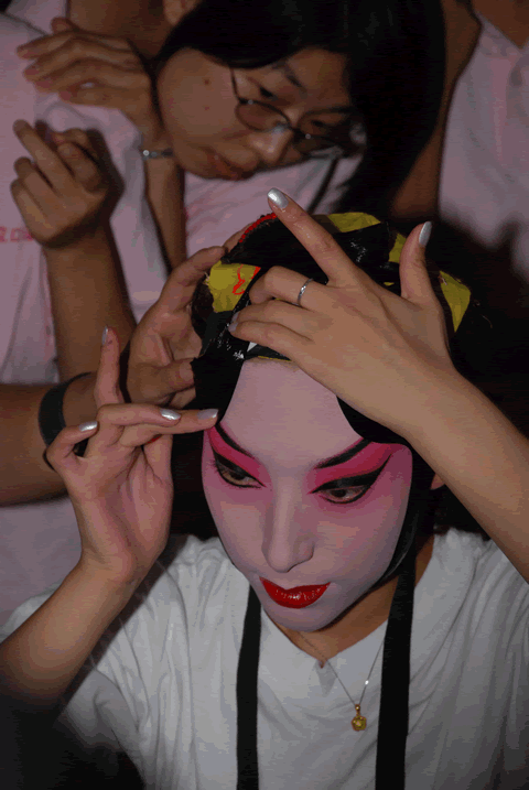 封閉營的學生們來自五湖四海,平時接觸的都是簡單的校園生活。從來沒有見過這樣的陣勢,眼前看到的活生生的臉譜和人物與在電視中看到的京劇,真有很大的差距。看著演員們的現場化妝、現場演唱以及現場表演,同學們都爭先恐后地與演員們零距離接觸,化一個艷麗的舞臺妝,學著表演幾下,揮動幾下手,來一個身段,還頗有一些專業演員的味道呢。