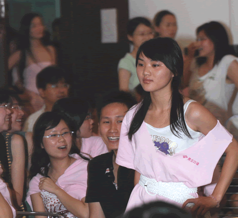然而,高口E組女生模特時裝秀節目的上演,又將全場帶入了火熱的氛圍。十幾位如花的少女,身著重新裁剪后的創意封閉營校服,令大家眼前一亮,紛紛驚嘆她們的獨具匠心。有的將校服的袖子去掉;有的在上面掏了幾個洞;有的裁成三角型系在身上;有的則裁成不規則形狀,全新演繹中,令大家感受到時尚與現代的強烈氣息。