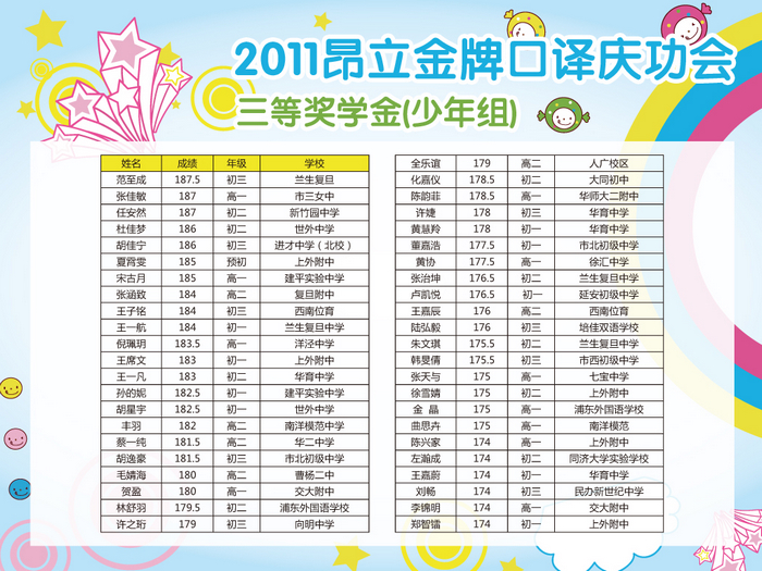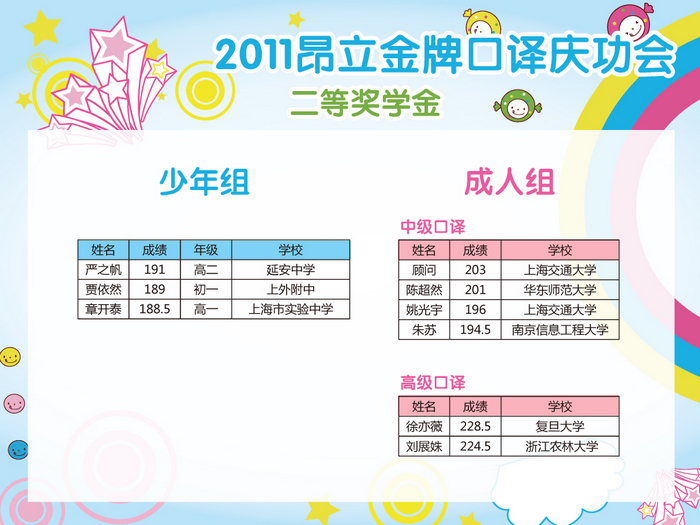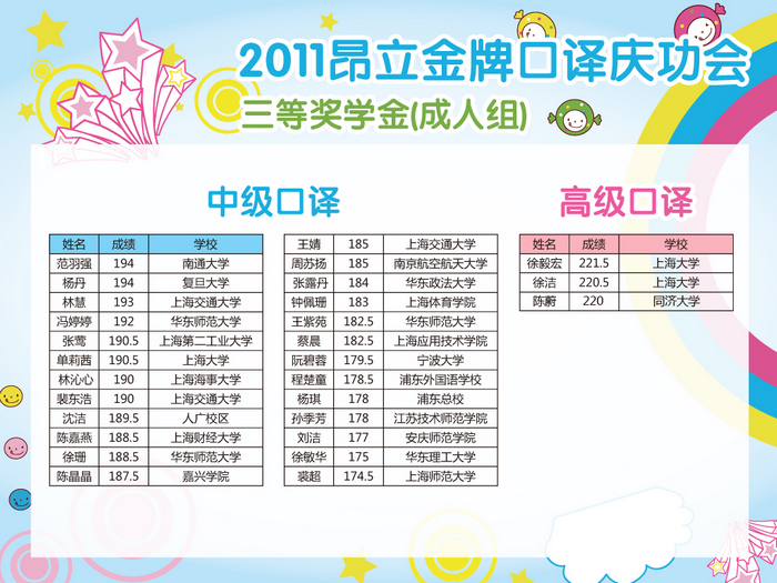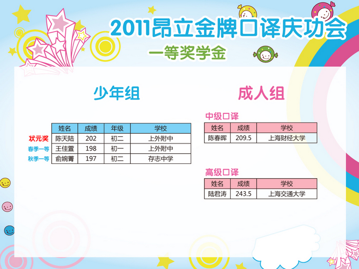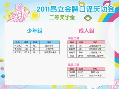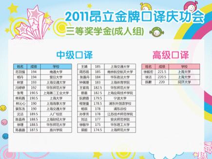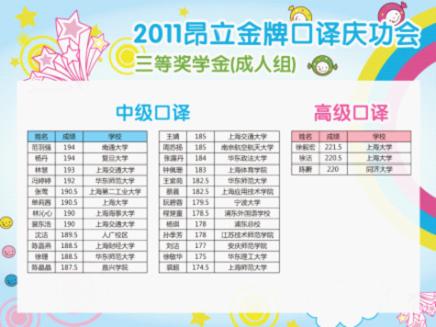 本年度中高口口譯(包好少年中口、成人中高口)高分學員經過電話回訪、短信通知、講座現場通知等多渠道收集信息后,根據合理、公正、公開的原則,高分榜已公布。并于2011年10月29日晚昂立徐匯校區進行了盛大“2011年度昂立金牌口譯慶功會 —暨中高級口譯高分學員獎學金頒發典禮”,相應高分學員已領取獎學金。