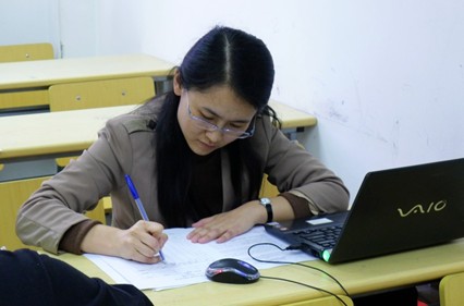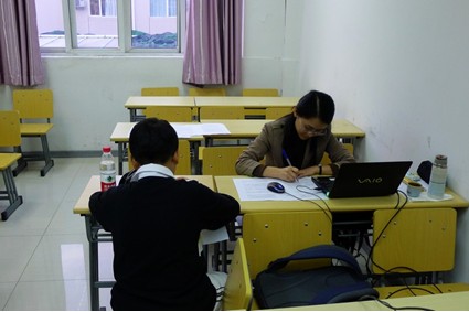 第三考場的口譯項目部聽力組組長劉寒露老師認真記錄考生考試情況