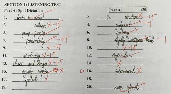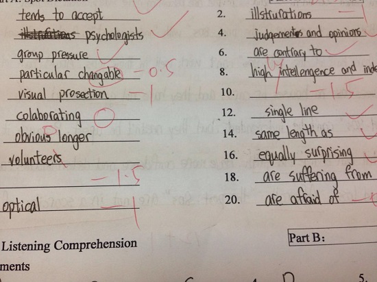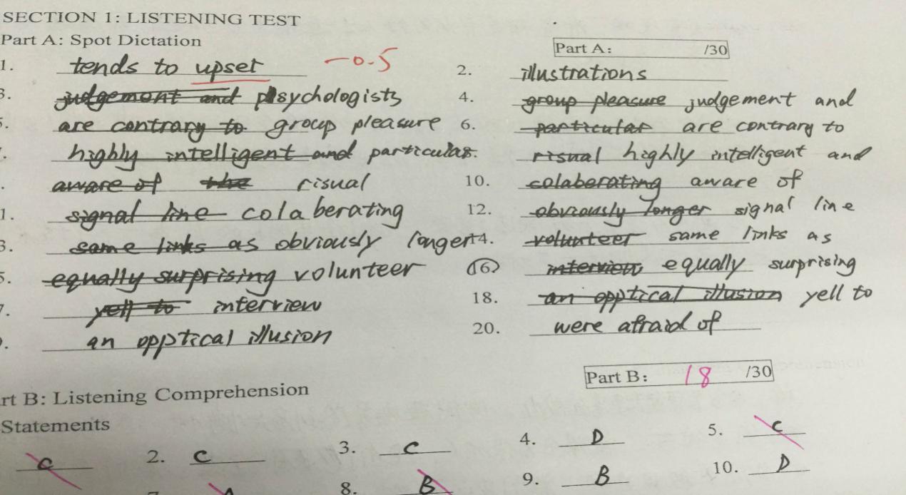 2. 在謄寫的音樂時間一般有2分半鐘左右,即使在這段時間謄不完,我們仍然可以在聽力部分結束,耳機摘下,在做閱讀和翻譯部分之前,把SD 的答案謄寫完整。所以在謄寫時,請大家務必檢查一下詞性等語法錯誤。比如說空格前有be動詞,空格內就肯定不是一個動詞原形,極有可能是過去分詞構成被動語態。有的時候考卷上的筆記可以告訴你是什么詞,但是終歸詞性還是要根據上下文檢查,比如說上文提到的過去分詞會弱讀的 “ed”。下圖這位同學的詞性錯誤比較多,但這完全是可以通過檢查避免的。