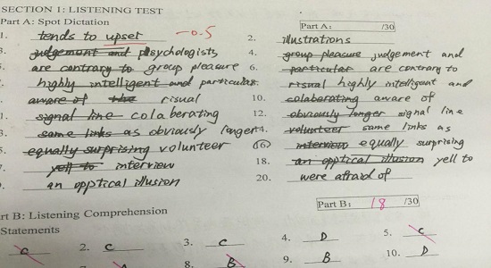 4. 考試時,并不會發記錄紙,但聽譯部分考卷上會有空白部分,是給同學做筆記用的。但是考卷上的筆記,要及時轉化成文字直接寫在答題紙上,答題時注意答題篇幅橫線。下面這位同學就把筆記記在了答題紙上,再劃去,直接導致卷面的不整潔。