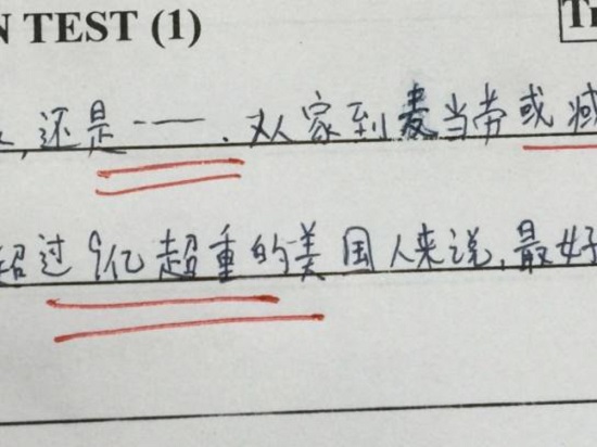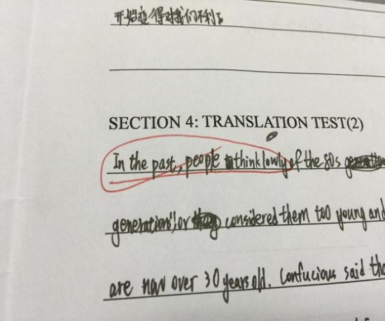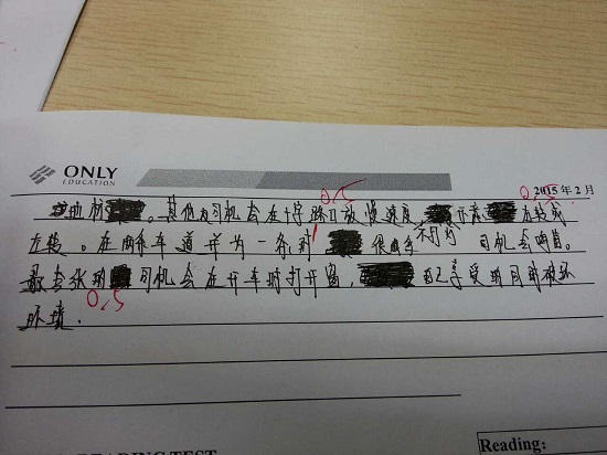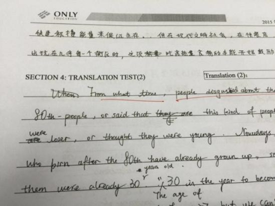 1. 既然要寫,請大家牢記examiner-friendly的原則,保持卷面清潔,不要有過多的修正符號以及涂改的痕跡,這樣會給老師批卷帶來非常多的麻煩,而影響最后的得分。此理同樣適用于翻譯部分。 下面兩張圖,就是犯了這樣的錯誤。