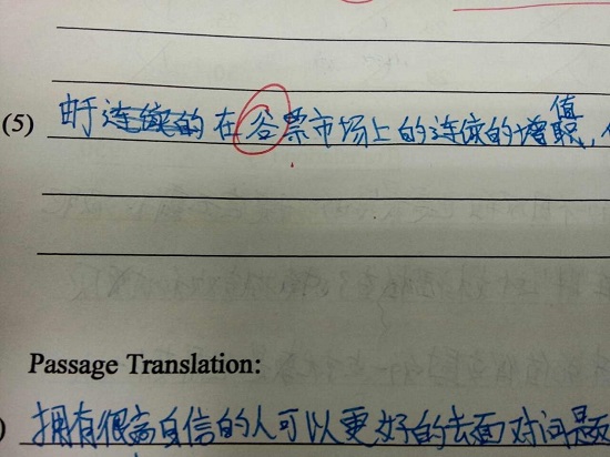 1. 語法問題。老生常談的問題,也是扣分最為厲害的部分(當然英譯漢不涉及語法問題),主要還是發生在漢譯英的時候,在此列舉些閱卷過程中學生所犯的典型錯誤。1) 前后時態不一致,There was a time when people love… 2) 動詞用法不到位,如:should to do/have grew等嚴重的錯誤。3) 前后不對等。如:Be more brave and more confidence,這里的brave是形容詞,confidence是名詞,顯然不對等。4)hard與hardly問題,有同學用It is hardly for them to…