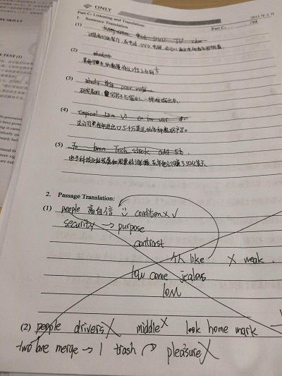 聽譯部分考驗同學捕捉句子段落主旨大意,快速筆記,以及最后組詞造句的能力,是筆試考試中最接近口試的題型,唯一區別在于筆試需要寫譯文,而口試只需說譯文。但正因為要寫,所以同學要避免的問題就更加多。請同學注意以下幾點: