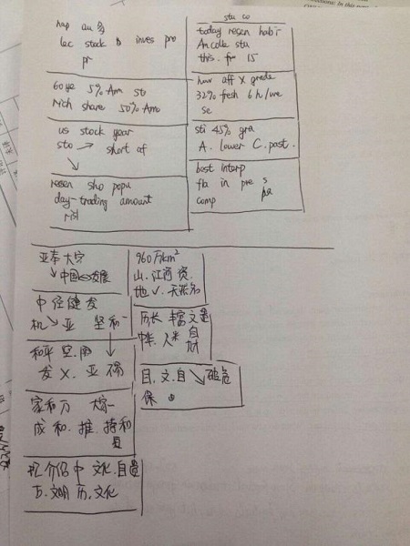 口譯部分筆記記在一張A4紙上,每段之間橫線隔開,縱向記關鍵詞