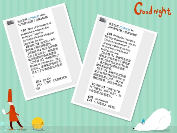 答:推送的內容包含【事】,即一條新聞,加上兩位老師的翻譯,便于大家互相比較!咀ⅰ考磳σ陨戏g的評價以及意見,在推敲細節中一起探討兩種語言的異同。配有【辭】和【義】,即這條新聞中一個詞匯或短語以及它的解釋。
