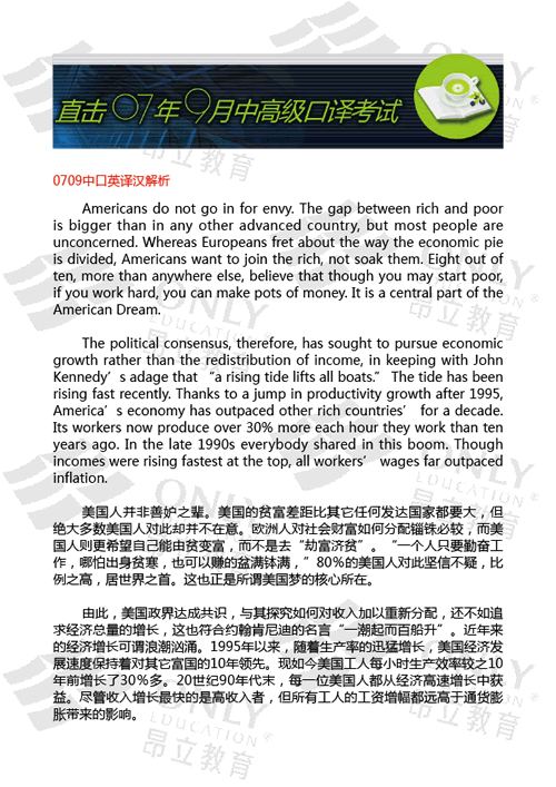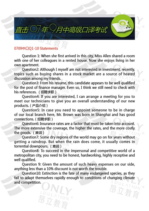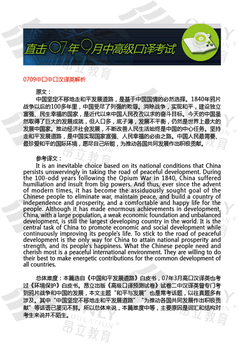 07年9月高級口譯考試心得 今天參加了高口的考試。做完聽力后,首先看的就是英譯漢了。這部分有50分,老師說...