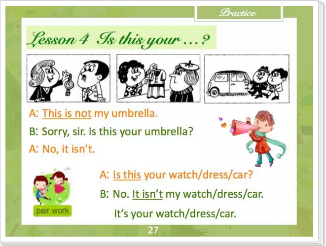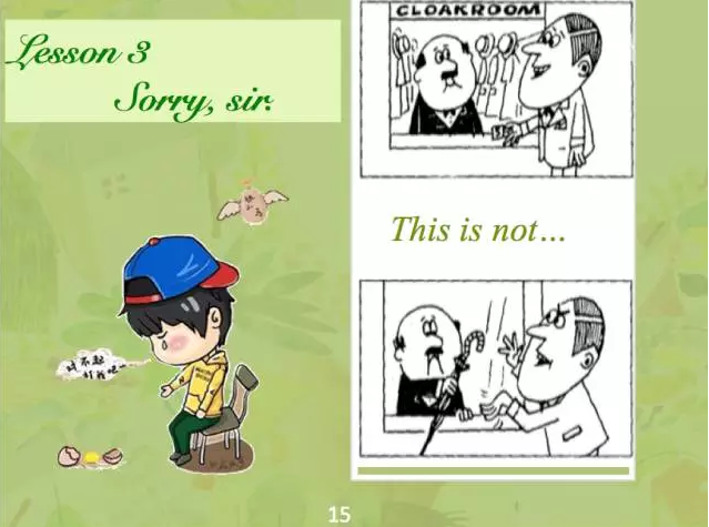以新概念 Ⅰ 的3、4課為例,我們課件的首頁會由兩幅課本插圖將孩子帶入到特定的場景中,讓他們設想一下自己是其中的角色會如何對話,從而引出This is not (my umbrella)的句型以及Sorry, sir這個簡單的回答語。