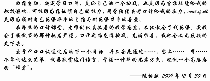 近日,2009年秋季第二次口譯口試成績揭曉,昂立少年班的口譯小學員們繼20099月筆試后,再接再厲一次性通過口試,他們是:陳怡然、薛怡然、錢簫揚、夏瑜偉、李正卿和陸卓珺。