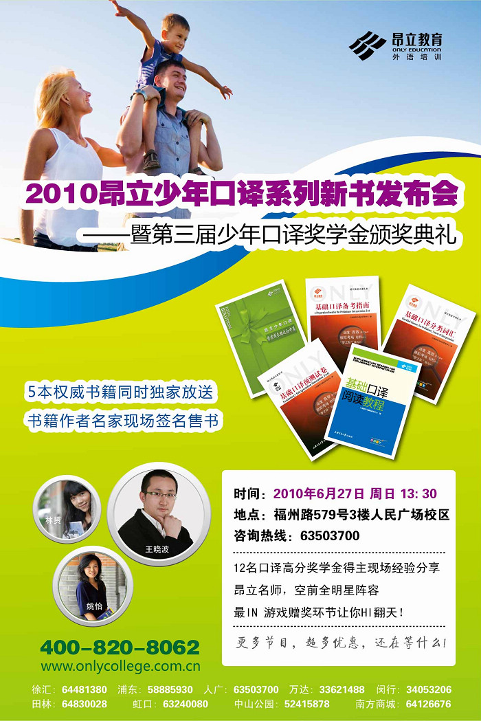 活動不但邀請到了4本書的編者前來簽名售書,更邀請到了前所未有的強大嘉賓陣容。到場的嘉賓有:昂立教育教研院院長,上海外國語大學英美文學碩士。著名英語教學專家,王曉波老師;昂立少年項目部主任,新概念、口譯授課專家、新概念大賽、考前峰會創辦人,姚怡老師;昂立外語少年項目部副主任,昂立基礎口譯教研組長,少年口譯系列書籍主編,林赟老師等。陣容之全,前所未有。