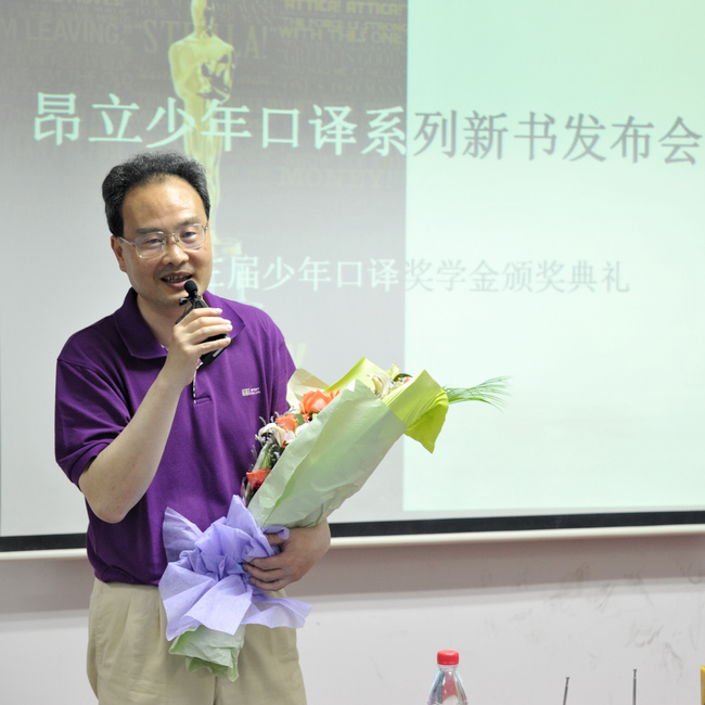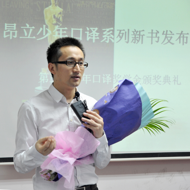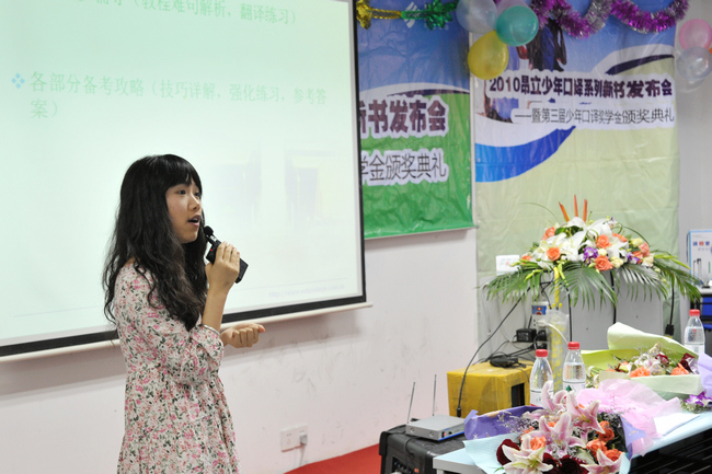 (昂立外語教研院院長王曉波鼓勵孩子們再攀高峰。) 昂立外語教研院長,專家名師王曉波開心地說,在過年的二年前,自已還是一個備受大學生追捧的明星教師,而如今,自己日益成為了一個深受中小學生喜歡的“孩子王”,歷經近二三年來,與昂立少年項目部老師們的不懈努力,昂立少年課程不斷完善,彰顯品質,以優異的成績受到越來越多家長與孩子們的認可與喜愛。如今,昂立少年課程無論是基礎口譯班、基礎口譯預備班、中級口譯、中級口譯預備班,還是少年新聞英語,少年新概念班,通過昂立少年項目全體老師們的努力,實實在在地做到了70%的合格率,以突出的教學成績受到社會一致好評,為此,感到特別驕傲。當然,我們將以此做為激勵,回報更加優異的教學成績。為此,將在基礎口譯,中口等教學中追求更高的通過率與學習實效。同時,在少年課程系列研發中,我們將再接再勵,為孩子們研發提供更多的精品課程,即將推出的少年托福、少年雅思、SAT、GRE等出國留學課程將為孩子們提供又一全新的學習空間。 同時,從今年秋季開始,昂立將開始嘗試預約聽課制度,使大家提前領略昂立教學的風采,為家長和孩子們提供選擇理想課程的機會。 新書發布:呈現精品,引領成長 慶功會上,昂立少年口譯名師團隊為孩子們帶來了一份厚禮:現場首次發布昂立獨家出版的四本基礎口譯學習寶典:《基礎口譯閱讀教程》、《基礎口譯預測試卷》、《基礎口譯備考指南》以及《基礎口譯分類詞匯手冊》,現場,昂立少年項目部副主任林赟老師為大家介紹了四本書籍的內容與特色,從不同角度為基礎口譯學生提供了全面的備考資料,是孩子們成功過關,考取高分的必備寶典。