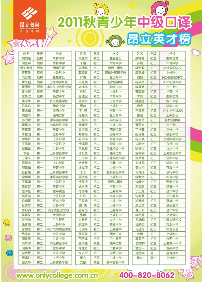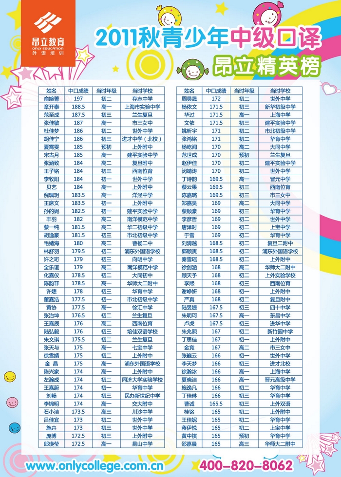 昂立教育 > 項目總攬 > 基礎口譯 > 少口新聞 > 2011秋青少年中級口譯高分榜