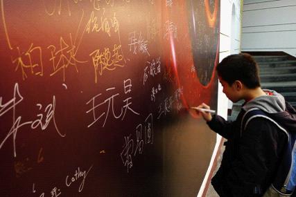 考生在簽名墻上留下自己的名字