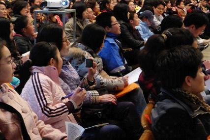 趙寧老師的聽力部分講座之后,王曉波老師請出了2011年秋季基礎口譯高分學員陳昕玥分享考試心得。陳昕玥是上海市實驗小學五年級的學生,基礎口譯考試獲得了167分的驕人成績。她向在座的基口考生傳授了自己在備考過程中所積累的經驗,并且鼓勵考生:大家不要被基礎口譯嚇倒,只要復習得很充分,你會發現考試其實很簡單。小小年紀但卻少年老成的經驗分享贏得了熱烈的掌聲。