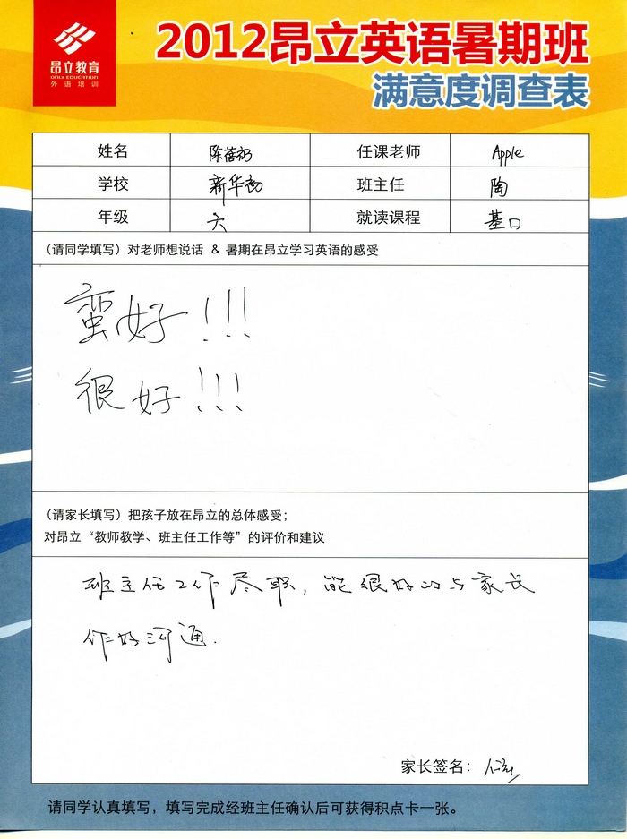 昂立教育 > 項目總攬 > 基礎口譯 > 學習體會 > 2012昂立英語暑假班滿意度反饋表-陳蓓礽