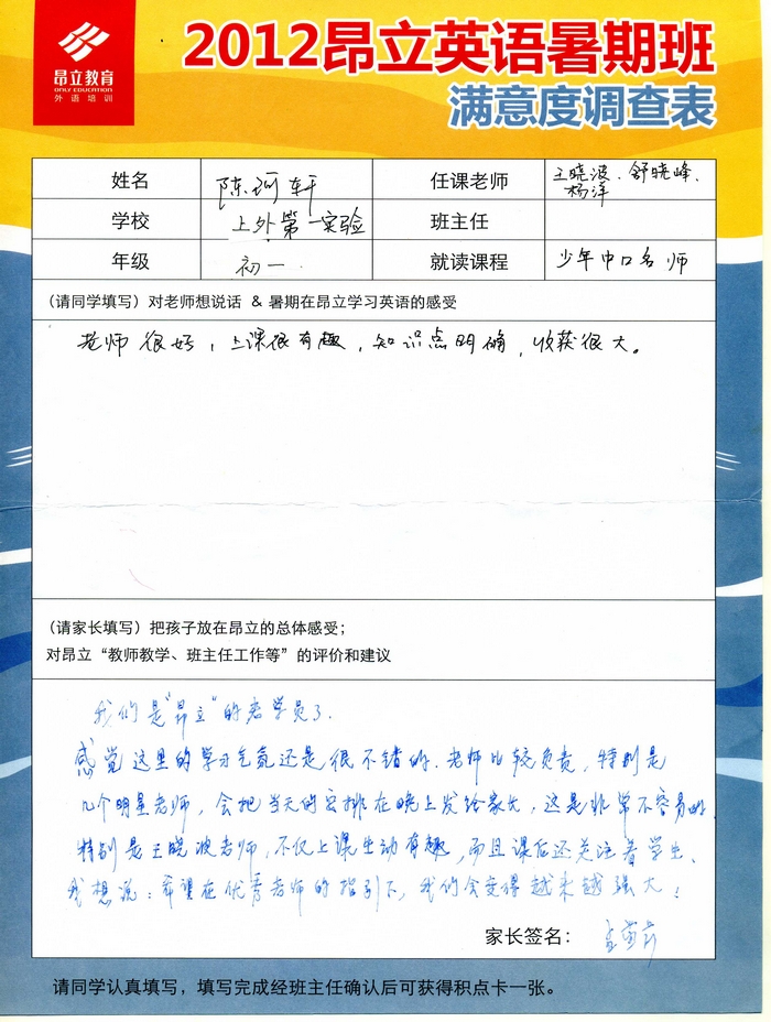 昂立教育 > 項目總攬 > 基礎口譯 > 學習體會 > 2012昂立英語暑假班滿意度反饋表-陳珂軒