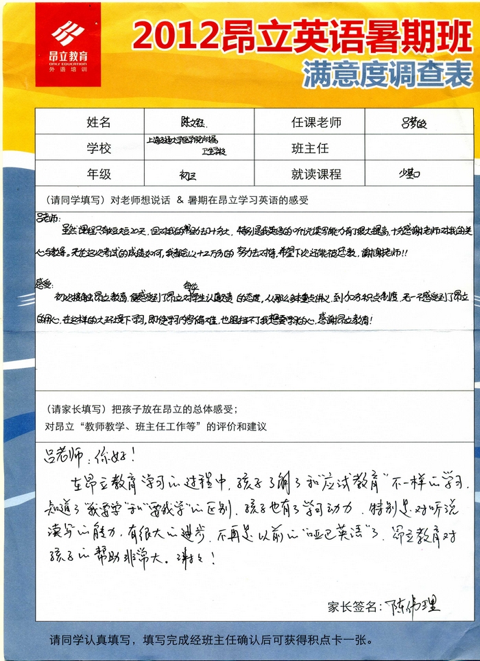 昂立教育 > 項目總攬 > 基礎口譯 > 學習體會 > 2012昂立英語暑假班滿意度反饋表-陳文鈺