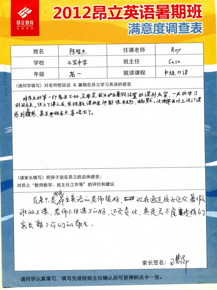 昂立教育 > 項目總攬 > 基礎口譯 > 學習體會 > 2012昂立英語暑假班滿意度反饋表-陳智杰