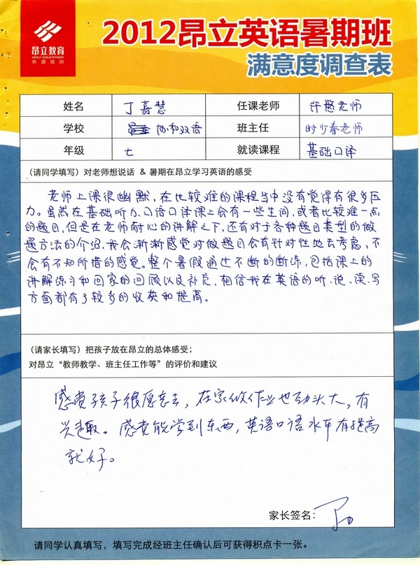 昂立教育 > 項目總攬 > 基礎口譯 > 學習體會 > 2012昂立英語暑假班滿意度反饋表-丁嘉慧