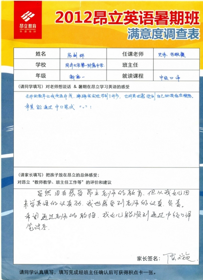 昂立教育 > 項目總攬 > 基礎口譯 > 學習體會 > 2012昂立英語暑假班滿意度反饋表-房劍樺