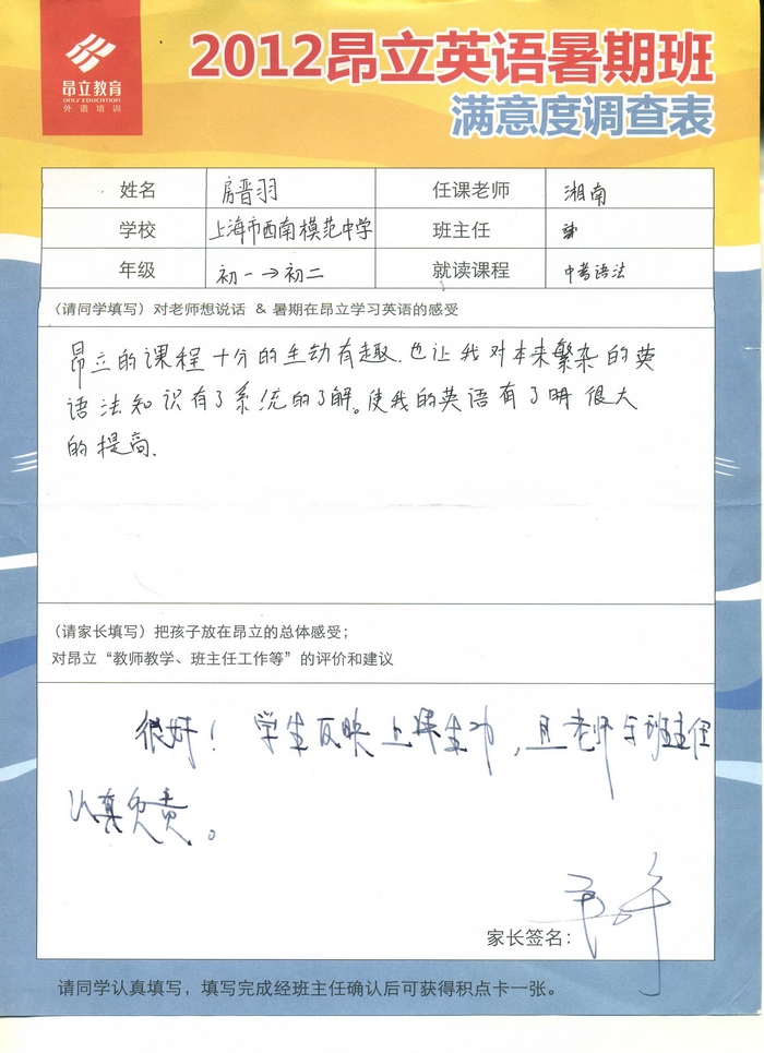 昂立教育 > 項目總攬 > 基礎口譯 > 學習體會 > 2012昂立英語暑假班滿意度反饋表-房晉羽