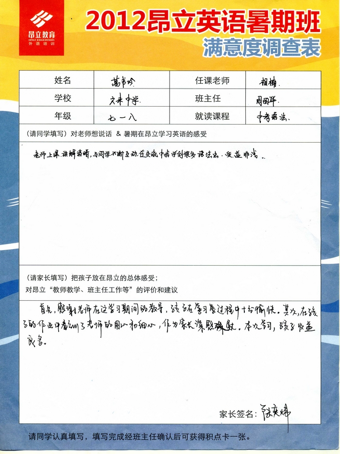 昂立教育 > 項目總攬 > 基礎口譯 > 學習體會 > 2012昂立英語暑假班滿意度反饋表-葛書吟