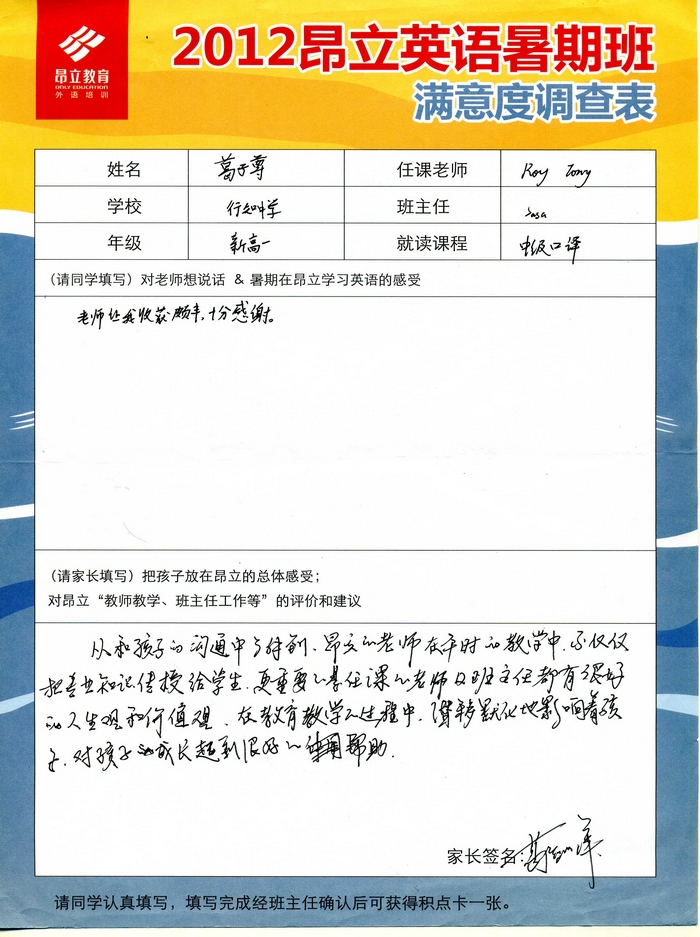 昂立教育 > 項目總攬 > 基礎口譯 > 學習體會 > 2012昂立英語暑假班滿意度反饋表-葛子尊
