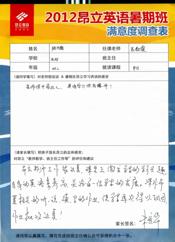 昂立教育 > 項目總攬 > 基礎口譯 > 學習體會 > 2012昂立英語暑假班滿意度反饋表-顧雨露