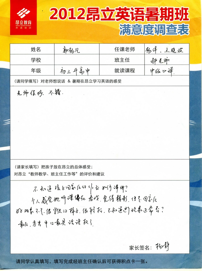 昂立教育 > 項目總攬 > 基礎口譯 > 學習體會 > 2012昂立英語暑假班滿意度反饋表-郭楊凡