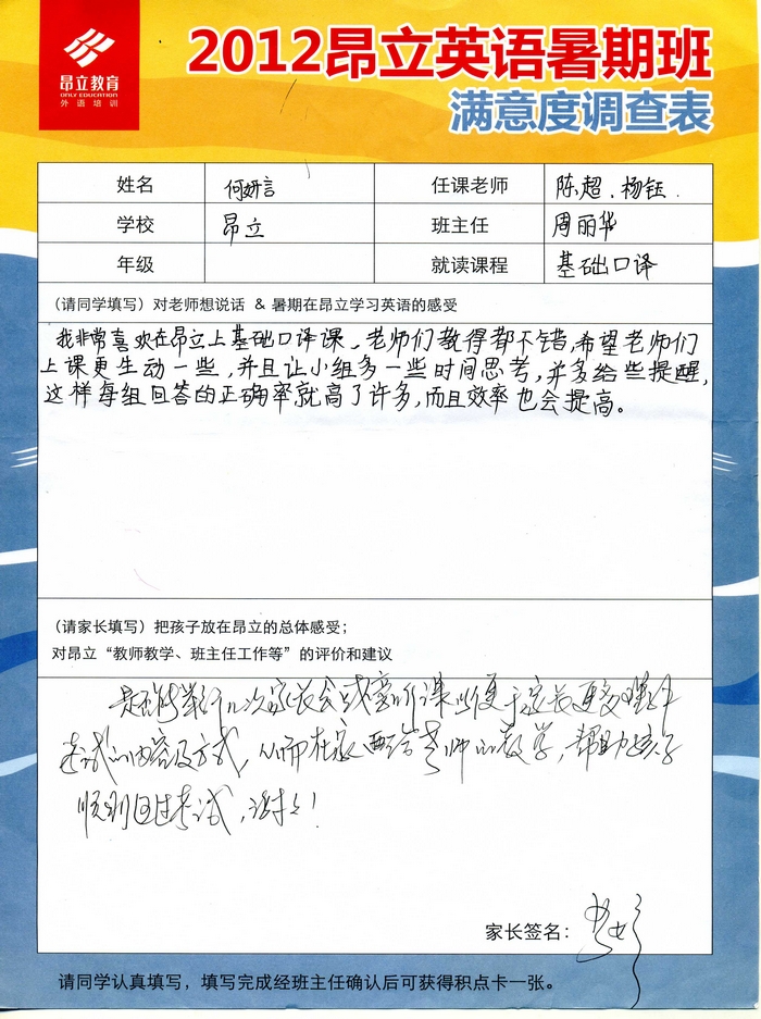 昂立教育 > 項目總攬 > 基礎口譯 > 學習體會 > 2012昂立英語暑假班滿意度反饋表-何妍言