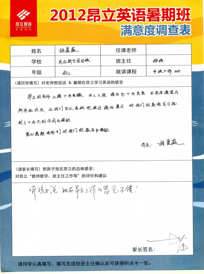 昂立教育 > 項目總攬 > 基礎口譯 > 學習體會 > 2012昂立英語暑假班滿意度反饋表-胡晨薇