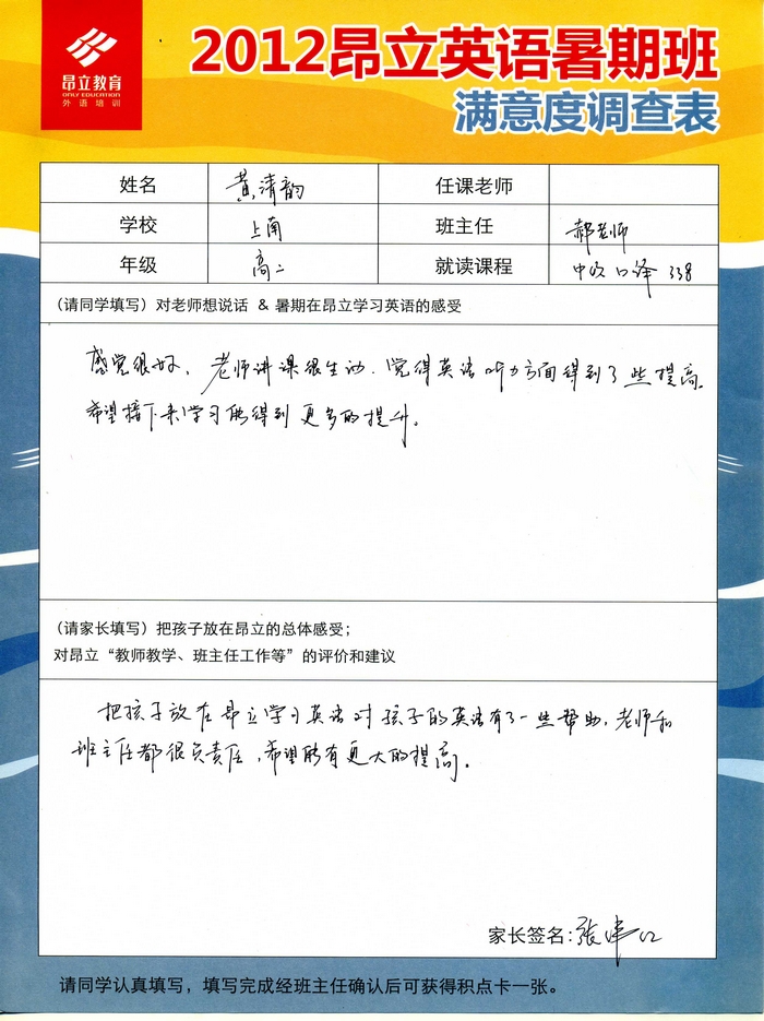 昂立教育 > 項目總攬 > 基礎口譯 > 學習體會 > 2012昂立英語暑假班滿意度反饋表-黃清韻
