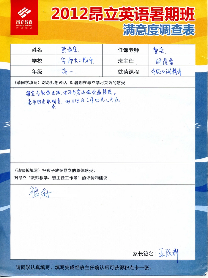 昂立教育 > 項目總攬 > 基礎口譯 > 學習體會 > 2012昂立英語暑假班滿意度反饋表-黃淑佳