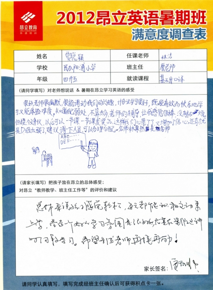 昂立教育 > 項目總攬 > 基礎口譯 > 學習體會 > 2012昂立英語暑假班滿意度反饋表-賈聰穎