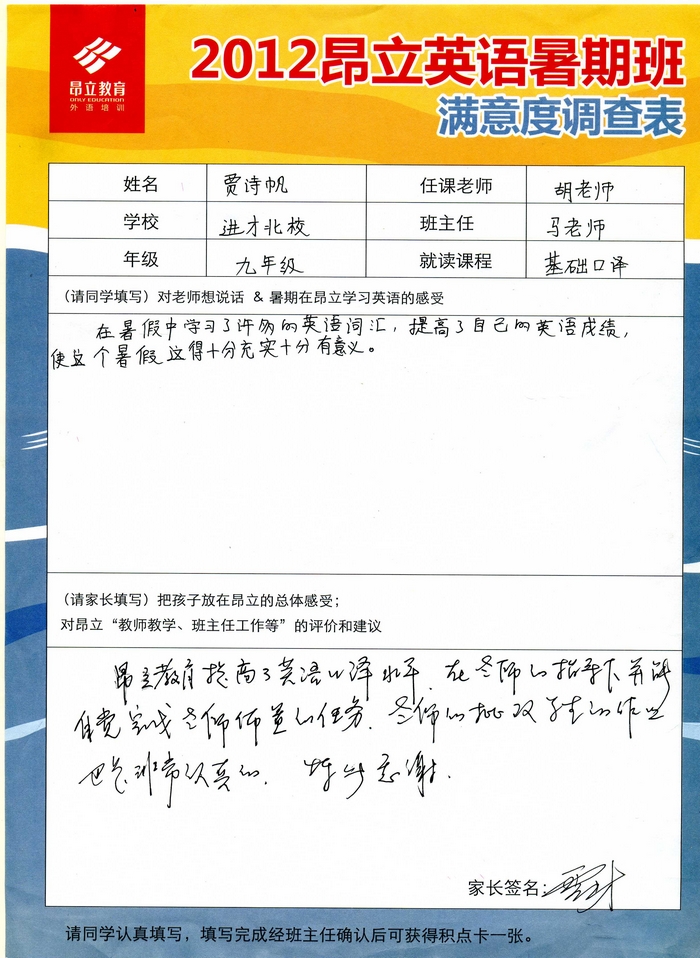 昂立教育 > 項目總攬 > 基礎口譯 > 學習體會 > 2012昂立英語暑假班滿意度反饋表-賈詩帆