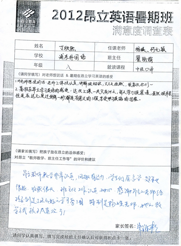 2012昂立英語暑假班滿意度反饋表-丁欣然