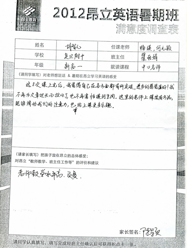 昂立教育 > 項目總攬 > 基礎口譯 > 學習體會 > 2012昂立英語暑假班滿意度反饋表-胡智元