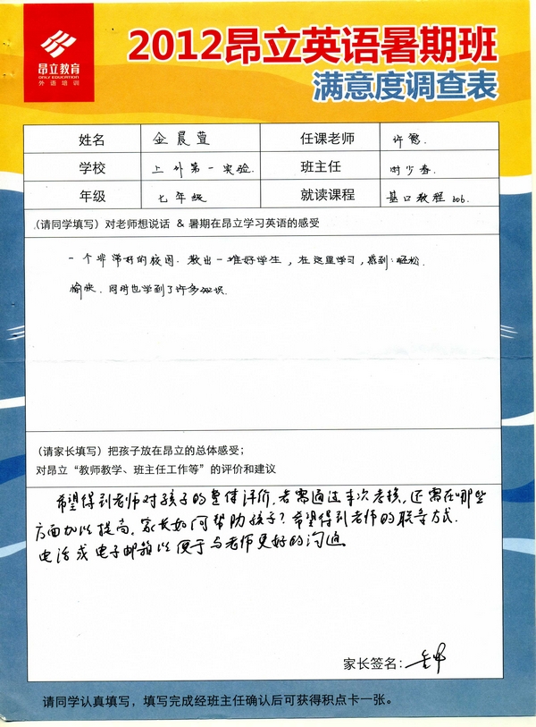 昂立教育 > 項目總攬 > 基礎口譯 > 學習體會 > 2012昂立英語暑假班滿意度反饋表-金晨萱