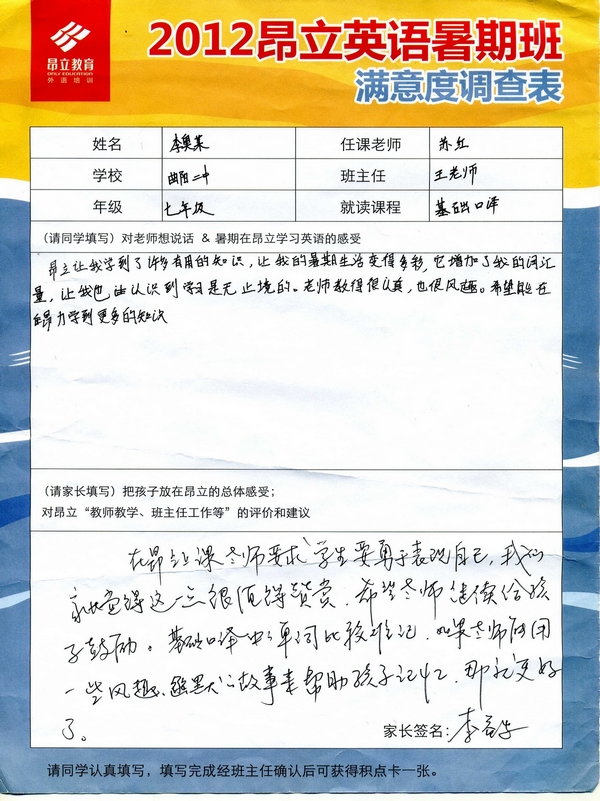昂立教育 > 項目總攬 > 基礎口譯 > 學習體會 > 2012昂立英語暑假班滿意度反饋表-李奧某