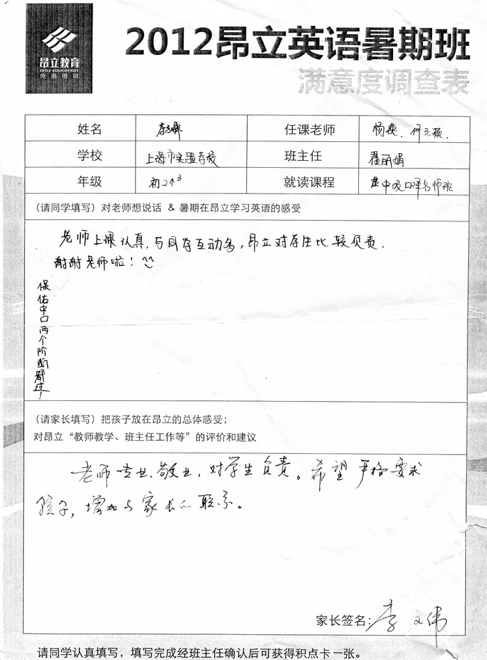 昂立教育 > 項目總攬 > 基礎口譯 > 學習體會 > 2012昂立英語暑假班滿意度反饋表-李承霖
