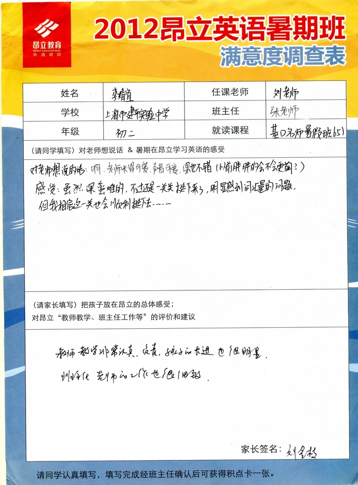 昂立教育 > 項目總攬 > 基礎口譯 > 學習體會 > 2012昂立英語暑假班滿意度反饋表-李婧宜