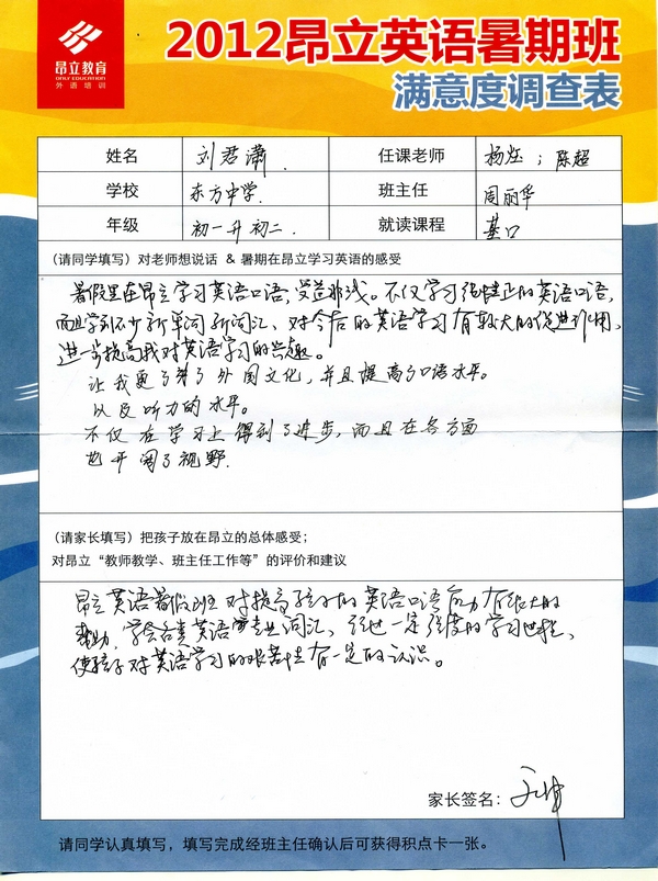 昂立教育 > 項目總攬 > 基礎口譯 > 學習體會 > 2012昂立英語暑假班滿意度反饋表-劉君瀟