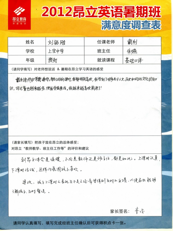 昂立教育 > 項目總攬 > 基礎口譯 > 學習體會 > 2012昂立英語暑假班滿意度反饋表-劉銘飏