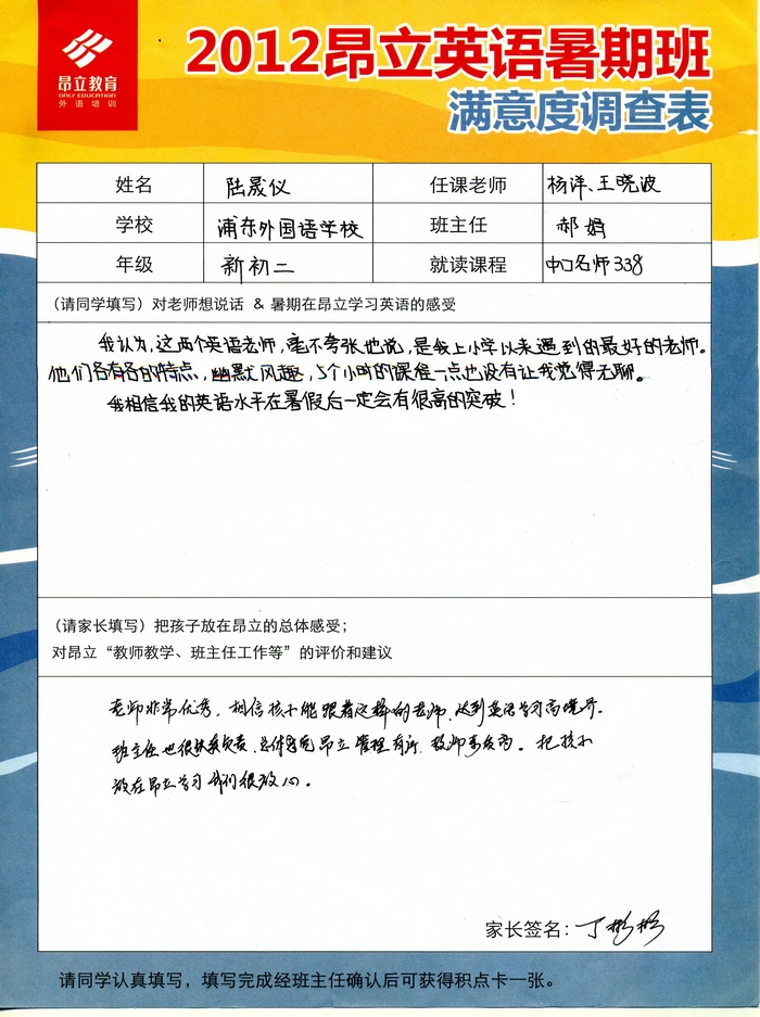 昂立教育 > 項目總攬 > 基礎口譯 > 學習體會 > 2012昂立英語暑假班滿意度反饋表-陸晟儀