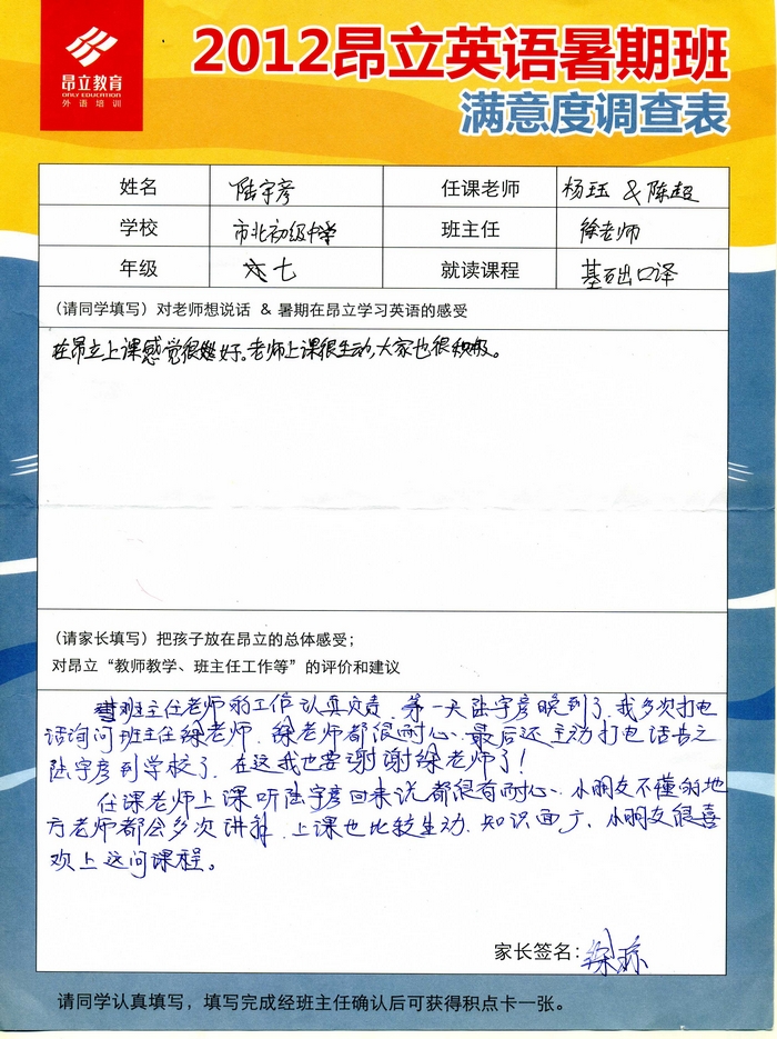 昂立教育 > 項目總攬 > 基礎口譯 > 學習體會 > 2012昂立英語暑假班滿意度反饋表-陸宇彥
