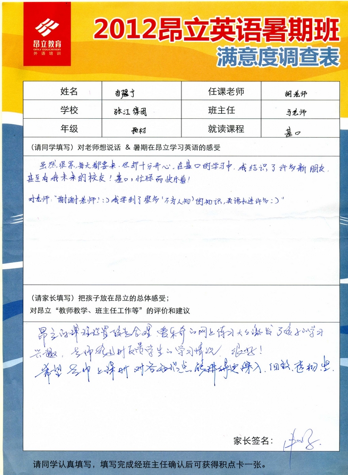 昂立教育 > 項目總攬 > 基礎口譯 > 學習體會 > 2012昂立英語暑假班滿意度反饋表-苗馨寧